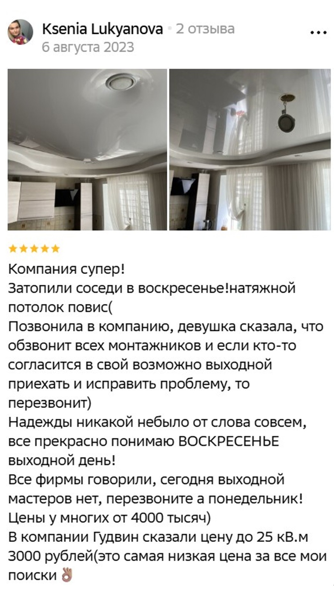 Действительно, если у вас стоит поливинилхлоридная пленка или ПВХ, то выдержать такое полотно способно до 100л воды на м2. Эластичное покрытие вытянется, но не порвется. После остановки течи мастер в Красноярске приедет, сольет воду, просушит потолок и вернет его на место.